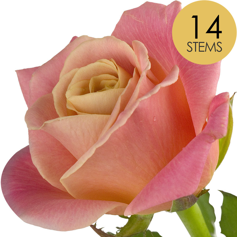 A bouquet of 14 luxuriously presented premium long stemmed peach roses hand-wrapped by a real florist using colour coordinated cellophane and silk bows from £67.40.