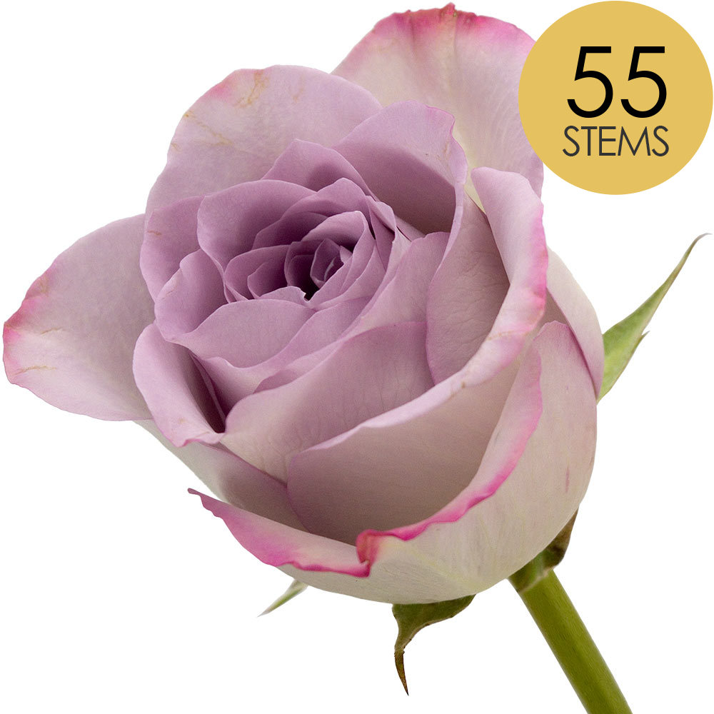A bouquet of 55 luxuriously presented premium long stemmed lilac roses hand-wrapped by a real florist using colour coordinated cellophane and silk bows from £218.69.
