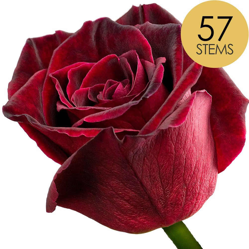 A bouquet of 57 luxuriously presented premium long stemmed black baccara roses hand-wrapped by a real florist using colour coordinated cellophane and silk bows from £294.07.