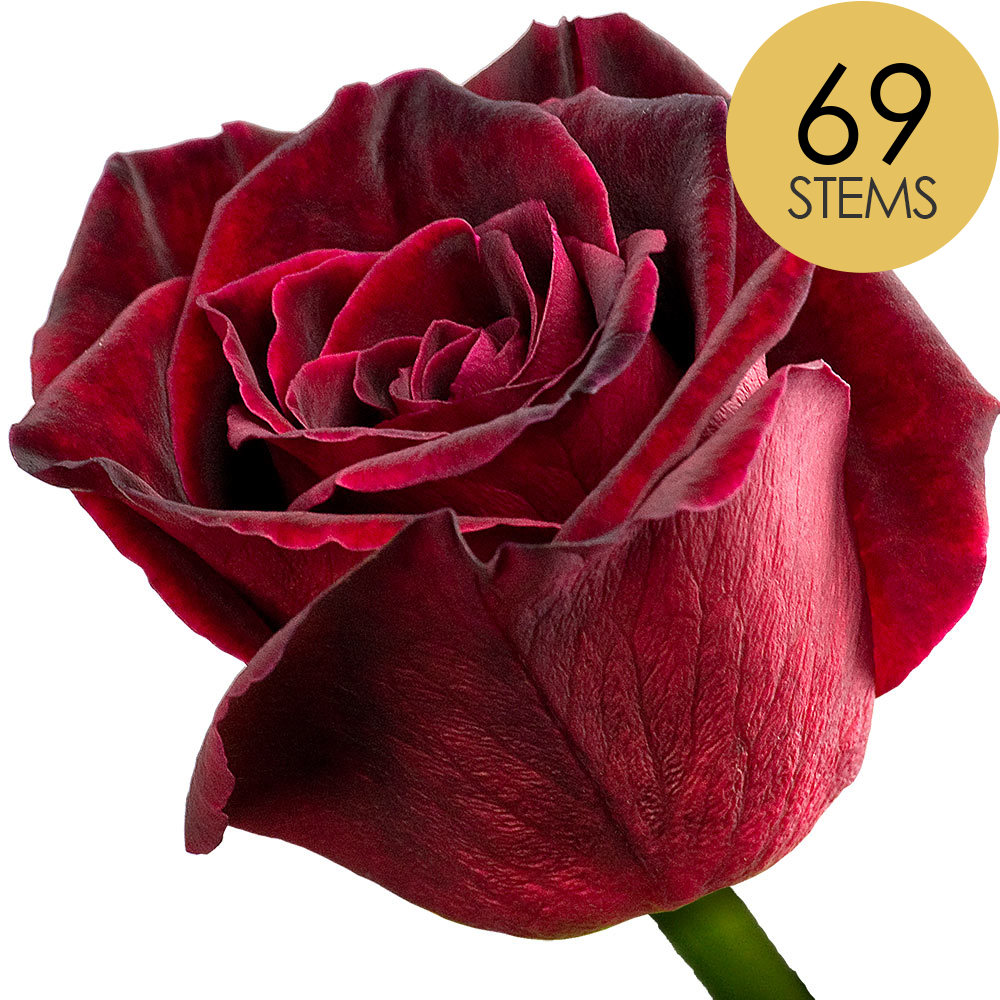 A bouquet of 69 luxuriously presented premium long stemmed black baccara roses hand-wrapped by a real florist using colour coordinated cellophane and silk bows from £350.35.